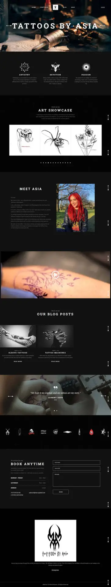 This project showcases my ability to design a visually striking and user-friendly website tailored for a tattoo studio. The website, Tattoos by Asia, blends creativity with functionality to provide an immersive online experience that reflects the artistry and professionalism of the studio.